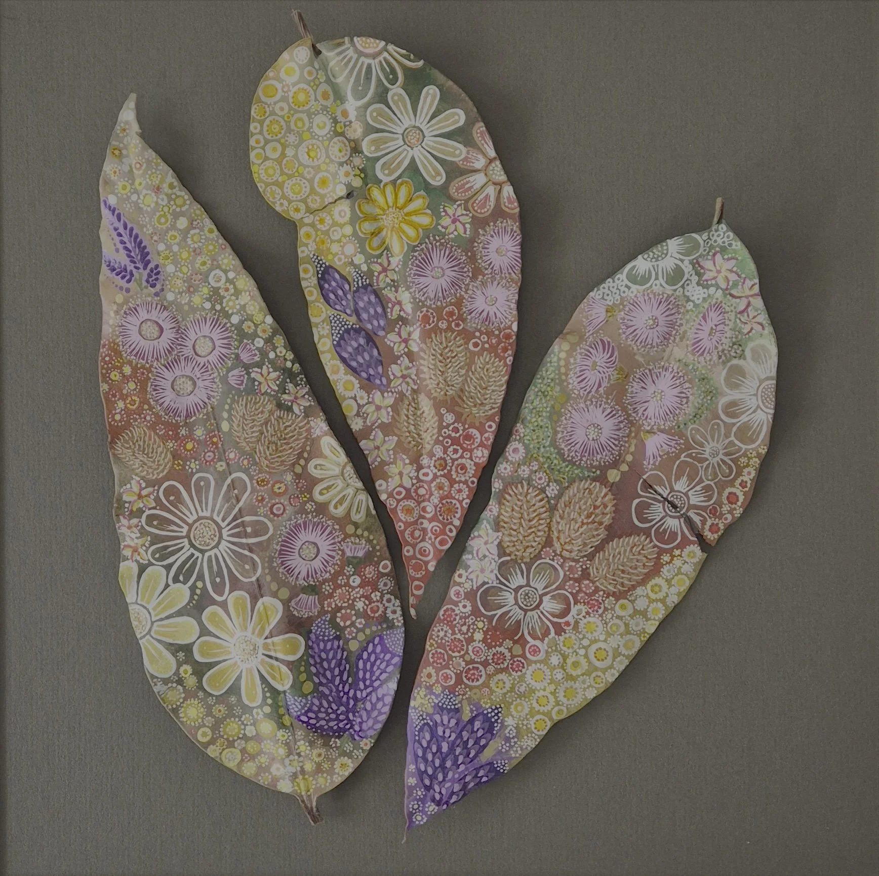 Nature, resilience, and creativity come together in my artwork, painted on Australian native leaves. Each leaf is carefully chosen and then transformed with colour, pattern, and imagination.